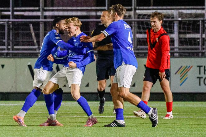 Vanaf dat moment moest AFC op jacht naar de gelijkmaker. Dit probeerden de Amsterdammers veelal van afstand, maar zonder succes. GVVV bleef stug doorvoetballen. ,,In die fase lieten we AFC te lang in leven door niet de 0-2 te maken”, vond GVVV-coach Gery Vink. Die 0-2 kwam uiteindelijk in de 87e minuut, toen invaller Krijn Meeuwsen scoorde. Hoewel AFC er nog een schepje bovenop probeerde te doen door dan maar harder de duels in te gaan, lukte het niet om de Veenendalers nog echt pijn te doen. Daardoor ontstond er na afloop van de wedstrijd een blauw feestje tussen de GVVV-selectie en de meegereisde fans.