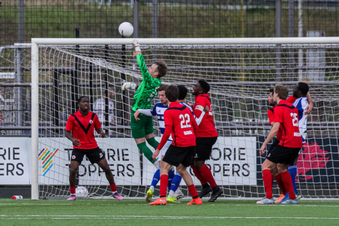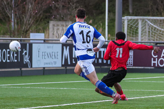 Doelrijpe situaties deden zich voor beide doelen nauwelijks voor. Delano Gouda en Radjenio Fonseca hadden geen geluk met hun schoten, terwijl aan de andere kant doelman Nolet een keer precies op de goede plek stond toen Des Kunst na een korte draai uithaalde.