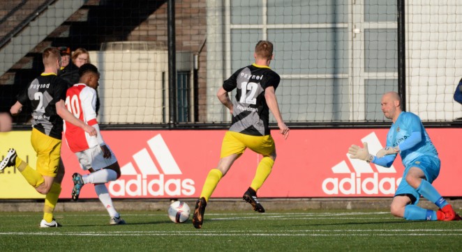Tussendoor kreeg de thuisploeg slechts twee mogelijkheden om iets aan de stand te doen. Een kopbal van Berry van ’t Land werd door een verdediger uit het doel gehouden en vlak daarna schoot hij een vrije trap voorlangs. Gezien de moeizame eerste helft leek het een lastige opgave te worden voor Ajax, maar in de tweede helft bracht de ploeg daar al snel verandering in. Direct vanaf de aftrap werd Stanley Akoy gelanceerd en oog-in-oog met doelman Wibo van Dijk maakte hij geen fout: 1-0.