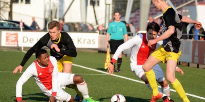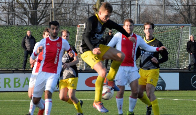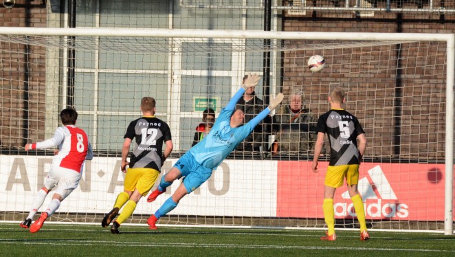 Bij één van de spaarzame uitvallen voor de gasten in de tweede helft was het wel raak. Martijn Brakke stond bij een hoekschop helemaal vrij bij de eerste paal en werkte de bal op fraaie wijze achter zijn standbeen hoog in de korte hoek achter doelman Stephan Veenboer: 1-1. Ajax raakte niet in paniek en had enkele minuten later de voorsprong weer in handen. Met een vrije trap van zo’n twintig meter liet Van ’t Land keeper Van Dijk kansloos voor de 2-1.