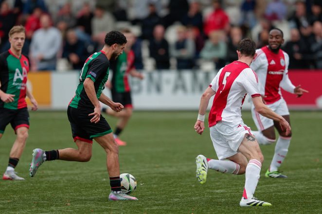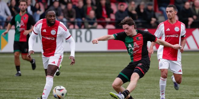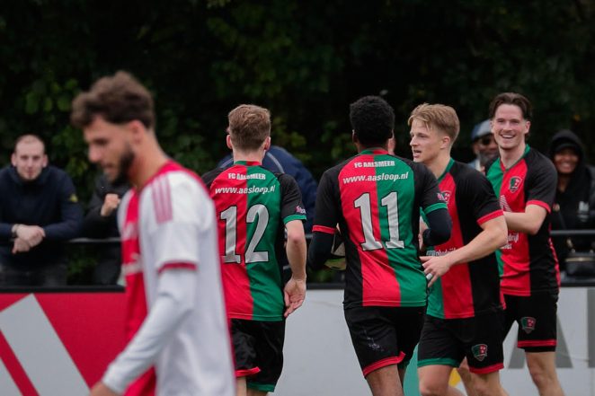 Het venijn zat in de staart van de eerste helft. Kort voor de pauze nam Aalsmeer verdiend de leiding: Luke Vahle kopte bij de tweede paal raak (0-1), terwijl Van der Mark er niet goed uitzag. Eerder had hij nog knap een schot van Noordam tot hoekschop verwerkt. Het antwoord van Ajax liet echter niet lang op zich wachten. Op rechts legde Lulinho Martins de bal panklaar voor Rogier Arduin, die de 1-1 binnen schoof.