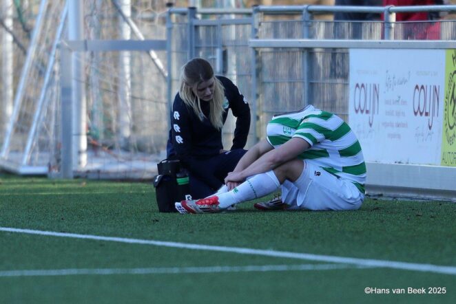 Na krap een kwartier sloeg het noodlot toe bij Bram Dekker. Brak hij aan het begin van het seizoen, tijdens de uitwedstrijd tegen Jong Holland, zijn middenvoetsbeentje en was hij maanden uit de roulatie, nu gebeurde dat opnieuw, maar in zijn andere voet. De verwachting is dat Dekker er weer een paar maanden uit ligt.