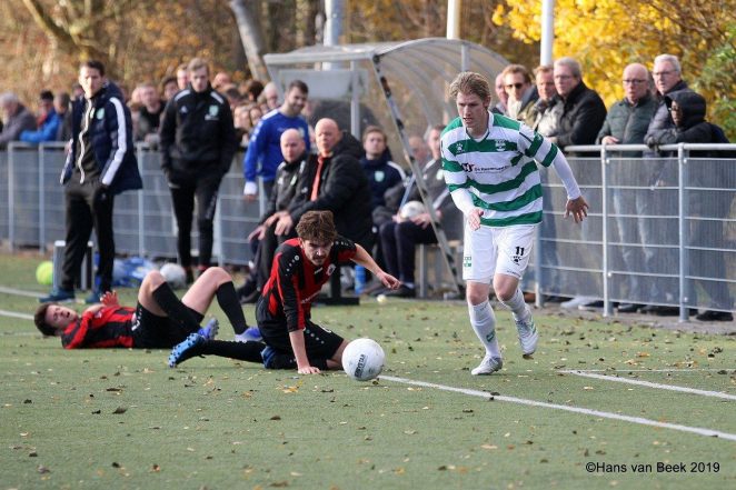 De eerste helft was goed aan beide kanten. Veel strijd, maar wel hier en daar wat slordigheden. Na bijna een kwartier was het Jaap Lorier die zich vrij speelde en Joep van Duinen vond die strak binnen schoot. Mats Valk was kansloos op zijn inzet. Na ruim een half uur voetballen kreeg Robert Lesmeister dé kans op de gelijkmaker als hij alleen op Sander vd Bogaard af mocht, maar de bal stuiterde van zijn voet af. Drie minuten later was het wel raak. Michael Coster kwam op links vrij en tikte fraai binnen. Vier minuten later was het Oualid Youssef die met een steekpass Robert Lesmeister vond. Weer was Sander vd Bogaard scherp en wist te keren. Vlak daarna was het VVA/Spartaan die in een snelle aanval de 1-2 had kunnen maken, maar Joep van Duinen kopte naast. Met 1-1 gingen beide ploegen de rust in.