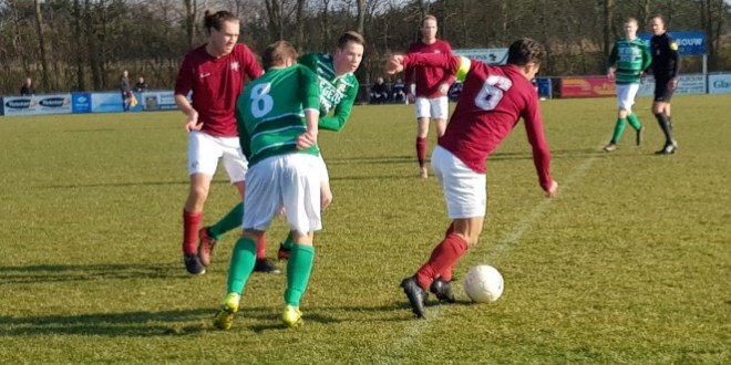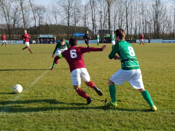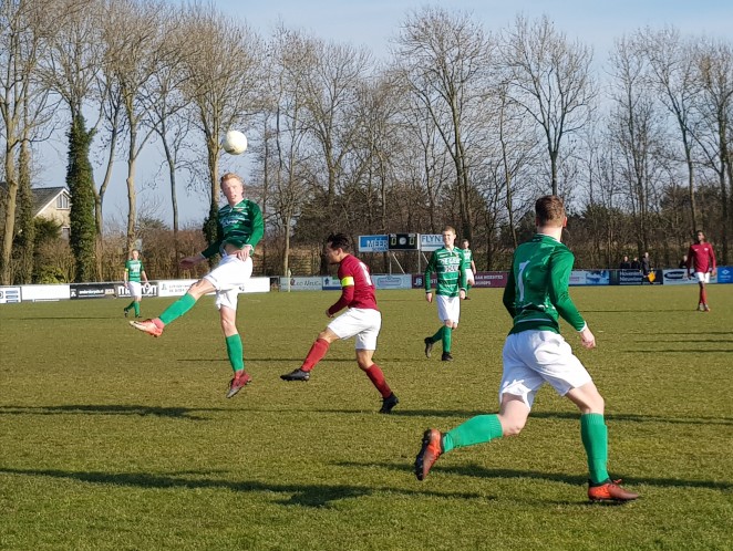 De grootste kans uit de eerste helft was voor de koploper. Doelman Levien Rocha wist met een knappe redding de kopbal van Brandsma te keren. Diezelfde Rocha was vlak daarna erg belangrijk toen een vrije trap van Dennis Rijs geholpen door de wind bijna in het doel vloog. De thuisploeg bleef mogelijkheden creëren en was voor de rust nog een aantal keer gevaarlijk. Zo mikte Harmen Snoek rakelings naast en schoot Bas Jonker na een dieptepass van Timon Plak onbesuisd naast.