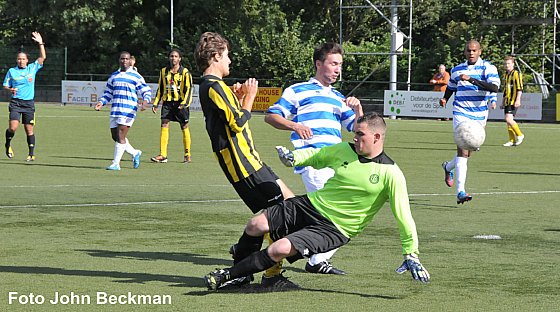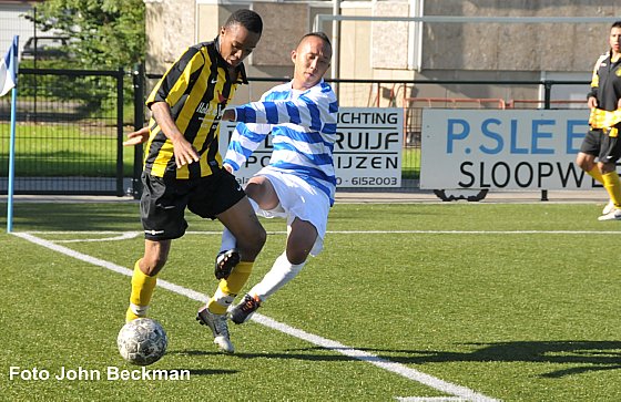 Onder het genot van een stralend zonnetje trapte de zaterdagsenioren van FC Blauw Wit Amsterdam en DWV om even over half drie af voor een onvervalste Amsterdamse derby. Met de uitslagen van de voorgaande weken nog in het achter hoofd begonnen de gastheren van Blauw Wit furieus aan de wedstrijd daar waar DWV aanvankelijk eerst nog de kat uit de boom keek. Na pakweg een kwartier merkte de gasten uit Noord dat er wat te halen was op Sportpark Sloten en namen na wat plaagstootjes over en weer brutaal de leiding. Een prima pass van Gijs Boerwinkel zette DWV spits Moamar Heerenveen alleen voor de Blauw Wit doelman. Heerenveen omspeelde het laatste opstakel en schoof de onverwachte 0-1 in het lege doel. Daar waar Blauw Wit niet verder kwam dan enkele afstandschoten daar bleven de DWV-voorwaartsen de mooiste kansen om zeep helpen. Na krap een half uur was het uiteindelijk toch raak en dit keer was Boerwinkel de afmaker na een perfect genomen hoekschop van nieuwkomer Romario Druivendal. Vlak voor het rustsignaal van de vrouwelijke en soms warrig fluitende arbiter Shukrula kreeg Blauw Wit een grote mogelijkheid door laks optreden van de DWV achterhoede bij een vrijtrap van de thuisploeg. Het geplaatste schot leek bij de tweede paal binnen te rollen maar een katachtige reactie van DWV doelman Jeffrey Boakye zorgde ervoor dat in de 0-2 stand tot aan de rust geen verandering meer kwam.