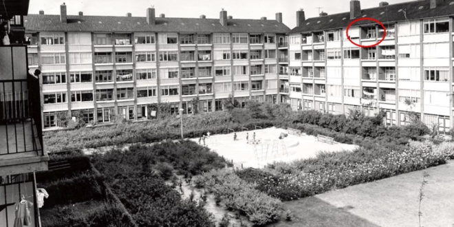 Tussen de huizenblokken waar ik woonde lag een ‘siertuin’, met een heerlijk grasveld waar de jeugd zich dan ook graag verzamelde voor een potje voetbal. Zoals u op de foto kunt zien woonden we in een soort megastallen en zoals elk nadeel ook hier zijn voordeel had, bulkte het er van de voetballustige knulletjes. En zo ontstond alras VCDW, Voetbal Club De Wildeman, genaamd naar onze straat, die op haar beurt weer vernoemd was naar de voormalige boerderij die ooit op deze plek had gestaan. Hele wijken waren op deze manier ontstaan en we speelden dan ook complete toernooien tegen andere straatclubs. Zo waren we bijvoorbeeld tegenstander van de toen nog toekomstig Ajax-voorlichter Davy Endt, die twee straten verderop zijn jeugd beleefde. Eigenlijk hadden we maar drie problemen: wie moest er keepen, wie had er een fatsoenlijke bal en hoe zorgden we dat die bal niet in de verkeerde tuin terecht kwam… Want de tuinen van de onderste woonlagen grensden aan ‘ons’ voetbalveld en lang niet iedere buurman was even vergevingsgezind als de bal weer eens tussen zijn begonia’s belandde en twee stijf van de adrenaline staande jongetjes over de heg doken om de bal weer te in het spel te brengen. Vragen kon natuurlijk ook, maar dan lag het spel weer minutenlang stil voor je omgelopen was naar de voorkant van het gebouw. Dus als het ook maar even kon en er niemand keek, sloegen we die beleefdheid maar even over.