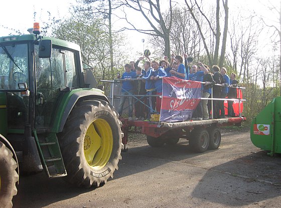 Na het laatste fluitsignaal kon het grote feest beginnen (na de pre-champions party vorige week in de Casablanca met de spits van Overamstel zie Youtube). Eerst al een feestje op het veld met de nodige bloemen, bier en champagne (zie foto)! Daarna zo snel mogelijk naar Loenen want de platte kar (zie foto), mogelijk gemaakt door de familie Kruiswijk, stond klaar om met de schaal door Loenen te tuffen. “Waar is een feestje, hier is een feestje….” Daarna werd er nog tot de vroege uurtjes gedanst en gedronken en uitgekeken naar het komende jaar in de 4e Klasse.