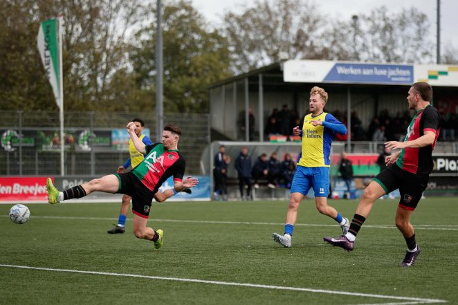 Na rust bracht keeper Bjorn Haggerty de thuisploeg dieper in de problemen. De doelman schatte een terugspeelbal – mede door de wind – verkeerd in, liet hem over zijn voet gaan en de bal rolde tergend langzaam het eigen doel in. Vanaf dat moment kwam er wat los bij de rood-groenen, ging het tempo omhoog en kreeg het loon na werken. Ilias Ahamout kreeg een duw in de rug in het strafschopgebied en verdiende zo een penalty. Deze werd vakkundig benut door Giliano Eijken. Even later kwam de formatie van Coach Tump op gelijke hoogte na een vlotte aanval over meerdere schijven. Ahamout had een steekbal in huis op Nick Koster die de bal goed voor trok en Bryan Iliohan rondde af na een mooi overstapje van Vahle.