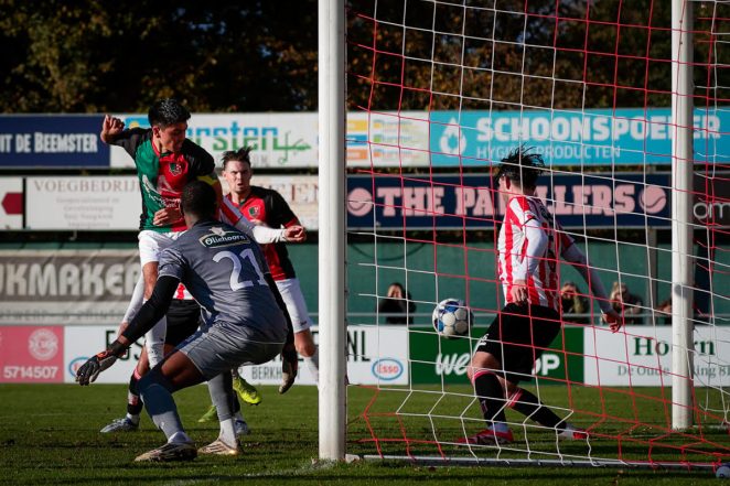 De openingsfase in Hoorn bood een levendig schouwspel met kansen aan beide kanten. Toch viel de eerste treffer aan Aalsmeerse zijde – zij het op komische wijze. Hollandia-doelman Shaquille Eendragt gleed op het natuurgras uit bij een simpele terugspeelbal, waardoor spits Luke Vahle dankbaar profiteerde. Met een bekeken schot schoof hij de bal in het lege doel: 0-1.