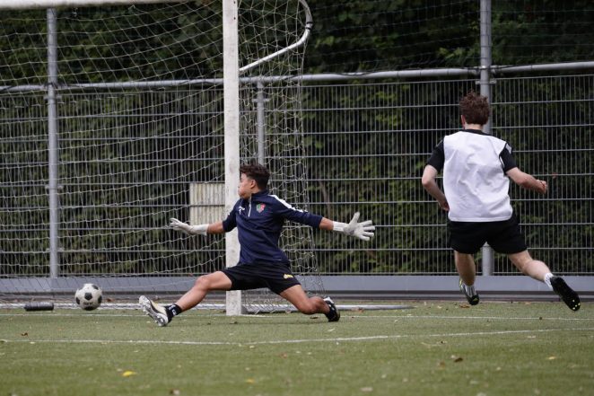 De laatste bekerwedstrijd in de poulefase was een stuk saaier voor de doelman: ,,Ja, dat klopt wel. We wonnen met 0-9 bij RODA’23 O17. Ik heb geen bal hoeven pakken, gewoon vlug inspelen zodat we door konden spelen. We stonden heel snel met 0-1 voor, we liepen tot de rust uit naar 0-4. De wedstrijd werd nog even ‘gestaakt’, omdat het onweerde. Daarna liepen we makkelijk uit.” Geen leermomenten? ,,Die zijn er altijd wel. Ik kreeg nog een filmpje doorgestuurd van Marijn. Bij een schot op doel moet ik mijn armen (uitgangshouding) wat meer ontspannen houden. Dus iets meer vóór mijn lichaam. Op die manier evalueren wij dus ook. Heel waardevol voor mij. Ik kijk ook naar zijn beelden, soms stuurt hij die ook door. Marijn heeft écht goede reflexen.”