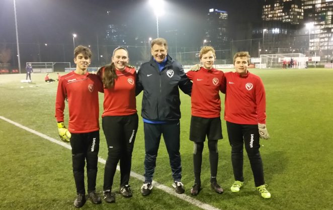 Als je Jan vraagt waar hij allemaal heeft gezeten, komt er geen gladgestreken cv, maar een stroom van herinneringen, met jaartallen, met namen, met fusies, met details. Het is alsof je door de voetbalkaart van Amsterdam en de regio reist. DVVA, Blauw-Wit, RAP, AVV Alphen, ROHDA ‘76, Hoofddorp, RODA ’23, NFC, SMS (later VVC), OFC, RKDES, Zwanenburg. En tussendoor bij grootmacht Spakenburg – “twee jaar bij Spakenburg als keeper-trainer, onder hoofdtrainer Henny Lee.” Jan noemt het zelf “een reis.” En dat is het ook: niet alleen geografisch, maar ook in rollen. Hoofdtrainer, assistent-trainer, keeperstrainer, jeugdtrainer. Bij Spakenburg noemt hij hoofdtrainer Lee een sympathiek mens. “Maar met andere trainers heb ik ook super fijn samengewerkt”, zegt Jan droog, bijna als kantinehumor. “Nu met Mitch Snijders bij Zwanenburg, maar zeker ook met onder andere Wessel Colijn, Ruud Visser en Hajo Hendriks. Het fascinerende is dat zijn verhaal niet draait om status. Jan gebruikt verenigingen niet als trofeeën. Hij praat over verenigingen zoals iemand praat over plaatsen waar hij echt heeft rondgelopen: met mensen. En hij is ook eerlijk over de clubs waar het niet klikte. ROHDA ‘76 in Bodegraven (gemeente Bodegraven-Reeuwijk, red.) bijvoorbeeld: “een Feyenoordbolwerk” waar hij als Ajax-man niet landde. Er waren “een aantal spelers” met wie het niet lekker werkte. Jan trekt er een les uit die klinkt als managementadvies, maar dan op gras: “Je moet wel iets pakken wat bij je past. Dat moet klikken, ook met de spelers. Ook bij SCW liep het niet goed af. Ik nam soms een vereniging om een vereniging te hebben. Dat is een wijze les geweest.”