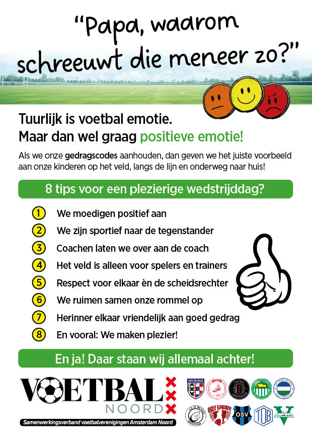 Sportief zullen ze elkaar blijven bestrijden, het eigen DNA en vereniging identiteit zal wel blijven bestaan. Leden trekken naar een bepaalde club vanwege het familiaire/ sociale gevoel, een ander zoekt juist de sportieve uitdaging en ambitie. Amsterdam Noord heeft en biedt het allemaal. Voor elk wat wils, jong en oud is welkom. Maar daarnaast zijn er genoeg overeenkomsten waarin verenigingen kennis kunnen delen en elkaar versterken: HBOK, OSV, De Dijk, asc De Volewijckers, De Meteoor, TOB, sv DRC, sv Kadoelen, sc Only Friends en Futsal Amsterdam sloegen daarom de handen ineen en beginnen aanstaande zaterdag 30 augustus aan een grote campagne ‘Papa, waarom schreeuwt die meneer zo’, om de ‘verhuferting’ op en rondom de velden tegen de te gaan. ,,We willen vooral positieve geluiden horen”, zegt Stam. ,,Emotie hoort erbij, maar wel positieve emotie.”