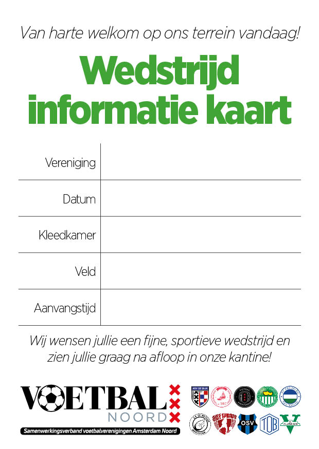 Op het publiek goed te informeren over regels en de samenwerking hangen er bij elke club twee grote posterborden; buiten aan de muur van het clubgebouw en binnen in het clubgebouw. Op zaterdagen, het gehele jaar door, krijgen bezoekende verenigingen, of het nu jeugd is of veteranen, naast de sleutel van de kleedkamer ook een ansichtkaart (wedstrijd informatie kaart) met daarom de regels die gelden voor, tijdens en na de wedstrijd. Daar krijgen ze nog een verhaaltje bij. Stam tot slot: ,,We leggen ook de hand aan onze website van Voetbal Noord. Zodra we alles compleet hebben gaat deze ‘in de lucht’, het streven is voor aankomend weekend. Wij zijn klaar voor het seizoen.”