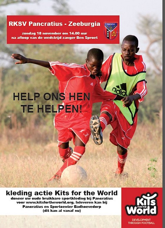 Pancratius gebruikt de wedstrijd tegen Zeeburgia om een actie te houden met betrekking tot het inzamelen van kleding. De club zet zich in voor de stichting KiTs for the World. Zij willen kinderen in ontwikkelingslanden een stimulans aanreiken (een kit). Als jongeren bijvoorbeeld bepaalde lessen volgen (over bijvoorbeeld hygiene of over HIV) dan krijgen ze een kit. Deze bestaat uit een set voetbalkleding en schoenen. Pancratius is nu een actie gestart om deze spullen te verzamelen. Ook tegenstander Zeeburgia heeft haar spelers en supporters opgeroepen om zondag spullen mee te nemen voor dit goede doel. Heeft u ook nog oude voetbalspuillen thuis? Neem ze dan mee en steun de stichting. Meer informatie over dit project is te vinden op www.kitsfortheworld.org