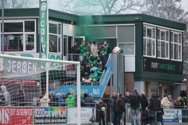 Toen het laatste fluitsignaal klonk, barstte het feest los op de club van RODA ’23. Er werd luid getrommeld en stadionfakkels verspreidden groene rook over het veld. In de kleedkamer zongen de Rodianen gezellig mee met de muziek en werd de prestatie uitbundig gevierd. “Deze periodetitel is superbelangrijk voor ons. Mooi om al een prijsje te pakken en we stellen daarmee natuurlijk de play-offs veilig, ongeacht de tweede seizoenshelft”, vertelt de blije aanvoerder Nick Leerkes.