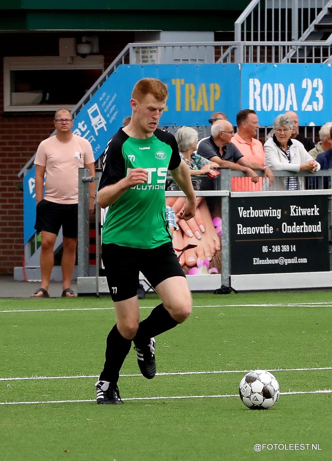 Bij RODA´23 viel het optreden van de jonge doelman Stijn Gorter op, die zich later in de wedstrijd – tijdens het derde blok – met een lichte blessure liet vervangen en ook een opvallende rol voor middenvelder Thomas van Baest. Van Baest, veelzijdig speler, trad de afgelopen seizoenen vooral op als verdediger en vorig seizoen bij nood aan de man als aanvaller. Bij een 2-2 stand, na blok twee (doelpunten RODA: Milan Egberts met de 1-1, Wisse Bos 2-1, Jair Plet 3-2, red.), mocht van Baest de douches opzoeken van trainer Gerard Aafjes en liet de RODA-oefenmeester een compleet nieuw team opdraven voor het tweede deel (blok 3 en 4) van de wedstrijd.