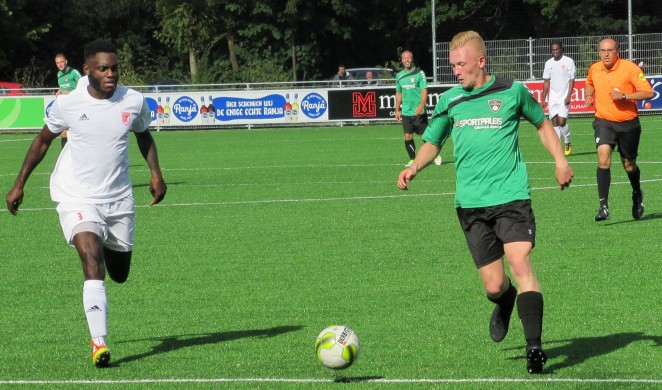 In de eerste helft waren beide ploegen goed aan elkaar gewaagd. Almere-doelman Gijs Roelofsen moest na vijf minuten al redding brengen op een inzet van Aaron Bruijn. Na ongeveer een kwartier spelen werd het door een hard en laag schot van Sohaib Echahbouni alsnog 1-0. Lang kon de zondag eersteklasser niet van deze voorsprong genieten: vijf minuten later hadden de Almeerders de stand weer gelijk getrokken. Koen Blommestijn, vorige week tegen Monnickendam (10-1) supersub met vijf treffers, werd in het strafschopgebied onderuit gehaald. De toegekende strafschop werd goed benut door Mike de Blieck: 1-1.