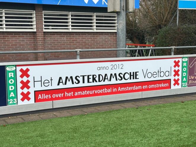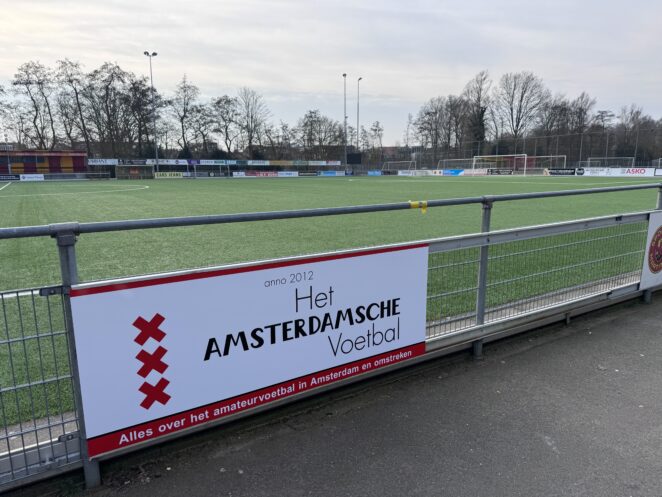 Verenigingen met een bord van Het Amsterdamsche Voetbal langs het hoofdveld