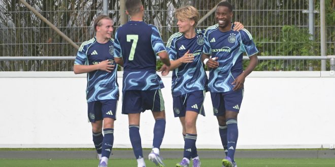 Het was quality time in Sassenheim, tenminste als je rood-wit bloed in je aderen hebt. Niet alleen mooie doelpunten en een verdiende voorsprong, ook het veldspel en de bereidwilligheid om voor elkaar te knokken deed menig Ajax hart sneller kloppen. De hand van Tobiasen wordt daarin langzamerhand zichtbaar. Kort voor tijd bereikte een snelle ingooi van de solide spelende Roy Deken ploeggenoot Antonia die vervolgens de benen nam, maar doelman Hoogervorst wist de bal met zijn voet nog te pareren. In blessuretijd gooide Ter Leede alle remmen los , vrouwen en kinderen eerst en zo werden alle ballen in de Ajax-zestien gepompt wat nog één hachelijke situatie opleverde tegen Ajax en voor Ter Leede maar daardoor was ook alle focus in de defensie bij Ter Leede volkomen verloren gegaan. Dat resulteerde voor Ajax in een uitbraak vanaf rechts, waar Lulinho Martins er inmiddels vandoor was gegaan en het boek deed sluiten met een droge knal en voor de 1-3 eindstand zorgde. Volgende week komt Odin ’59 op bezoek in Amsterdam. Kijk hier voor alle uitslagen, de stand en het programma in de Vierde divisie A